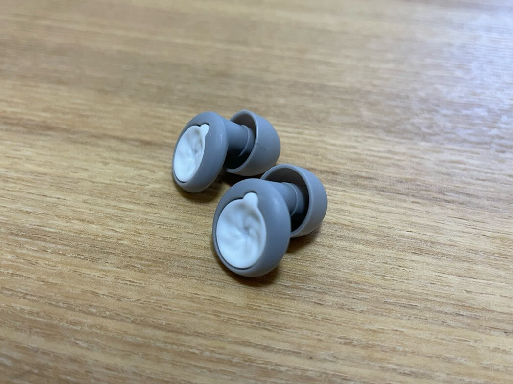 画像を見てもらうと、耳栓でありながら見た目がシンプル。ワイヤレスイヤホンのような感覚で装着できるのです。
